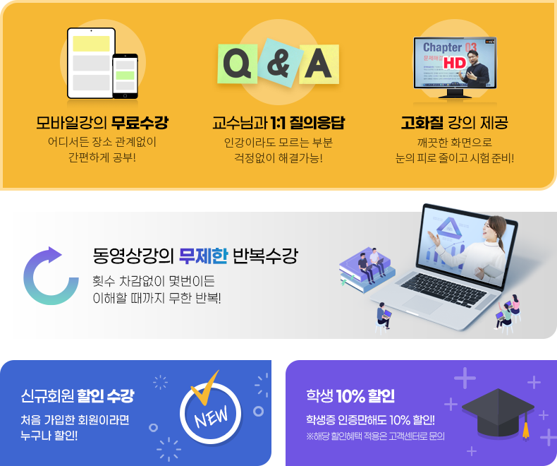 · 수강 취소 및 환불은 결제일로부터 7일 이내, 수강 변경은 수강시작일로 부터 3일 이내 가능하며 결제일로부터 7일 이내라도 수강시작 후에는 아래와 같은 환불규정이 적용됩니다 - (시청강의 수 기준) 3강 이하 수강 시 100% 환불 - (시청강의 수 기준) 3강 초과 수강 시 환불 불가 - 유료자료 2개이상 다운로드 시 환불 불가 · 결제일로부터 7일 이후에는 자동으로 수강이 시작됩니다. · 해당 강좌의 모든 내용을 수강하지 않았을 지라도 수강신청후 7일이 경과 하거나, 수강시작 버튼을 클릭하여 해당 강좌를 시작 하였을 경우 수강으로 인정 합니다. · 수강변경 : 패키지에서 단과 강의로 변경 시 단과 강의료로 산정하여 차액금 환불 됩니다. · 일시정지 : 3회 총90일(1회당 30일간 일시정지 가능, 무료강의 및 시험일까지 패키지에는 제공되지 않음/환불시 혜택적용 불가) · 무료로 제공되는 모바일 서비스는 기기 및 통신환경에 따라 서비스가 불가능한 경우가 있으며,이로인한 취소 및 환불은 불가능 합니다. · 재수강 신청시 수강료 정가의 20% 할인이 되며, 교재무료 이벤트 및 중복할인은 추가 제공되지 않습니다. · 이벤트로 인하여 추가되는 기간은 수강기간에 포함되지 않습니다. · 평생회원의 경우 수강기간은 1년을 기준으로 하며, 이후 불합격으로 인해 연장되는 수강기간은 서비스로서, 증정에 해당 됩니다. · 강의를 공유 또는 양도하는 등의 저작권 위반행위 적발시 법적 제재와 함께 구매하신 강의는 서비스 중단되며, 환불은 불가합니다. · 강의 공유를 예방하고자 영상캡쳐, 미러링, 미러캐스트 기능은 지원되지 않습니다. · 환불규정을 악용하는 사례가 적발될 경우, 서비스 이용이 제한될 수 있습니다. |