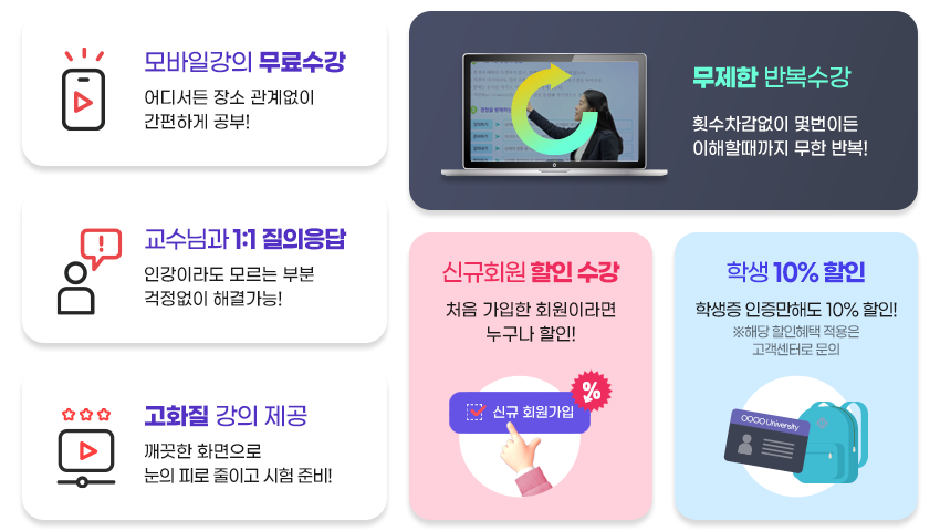 · 수강 취소 및 환불은 결제일로부터 7일 이내, 수강 변경은 수강시작일로 부터 3일 이내 가능하며 결제일로부터 7일 이내라도 수강시작 후에는 아래와 같은 환불규정이 적용됩니다 - (시청강의 수 기준) 3강 이하 수강 시 100% 환불 - (시청강의 수 기준) 3강 초과 수강 시 환불 불가 - 유료자료 2개이상 다운로드 시 환불 불가 · 결제일로부터 7일 이후에는 자동으로 수강이 시작됩니다. · 해당 강좌의 모든 내용을 수강하지 않았을 지라도 수강신청후 7일이 경과 하거나, 수강시작 버튼을 클릭하여 해당 강좌를 시작 하였을 경우 수강으로 인정 합니다. · 수강변경 : 패키지에서 단과 강의로 변경 시 단과 강의료로 산정하여 차액금 환불 됩니다. · 일시정지 : 3회 총90일(1회당 30일간 일시정지 가능, 무료강의 및 시험일까지 패키지에는 제공되지 않음/환불시 혜택적용 불가) · 무료로 제공되는 모바일 서비스는 기기 및 통신환경에 따라 서비스가 불가능한 경우가 있으며,이로인한 취소 및 환불은 불가능 합니다. · 재수강 신청시 수강료 정가의 20% 할인이 되며, 교재무료 이벤트 및 중복할인은 추가 제공되지 않습니다. · 이벤트로 인하여 추가되는 기간은 수강기간에 포함되지 않습니다. · 평생회원의 경우 수강기간은 1년을 기준으로 하며, 이후 불합격으로 인해 연장되는 수강기간은 서비스로서, 증정에 해당 됩니다. · 강의를 공유 또는 양도하는 등의 저작권 위반행위 적발시 법적 제재와 함께 구매하신 강의는 서비스 중단되며, 환불은 불가합니다. · 강의 공유를 예방하고자 영상캡쳐, 미러링, 미러캐스트 기능은 지원되지 않습니다. · 환불규정을 악용하는 사례가 적발될 경우, 서비스 이용이 제한될 수 있습니다. |