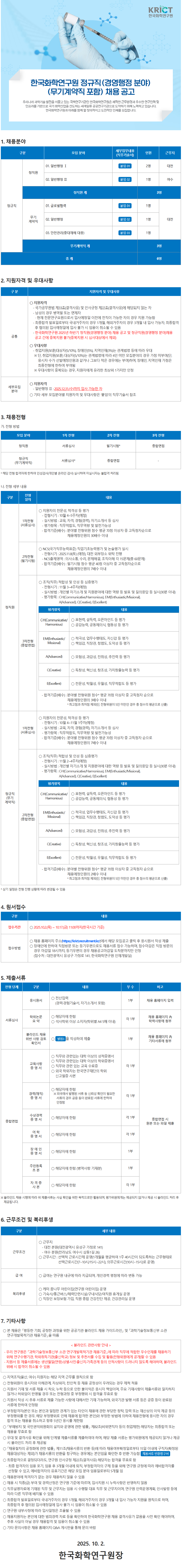 [한국화학연구원] 정규직(경영행정 분야) (무기계약직 포함) 채용 공고